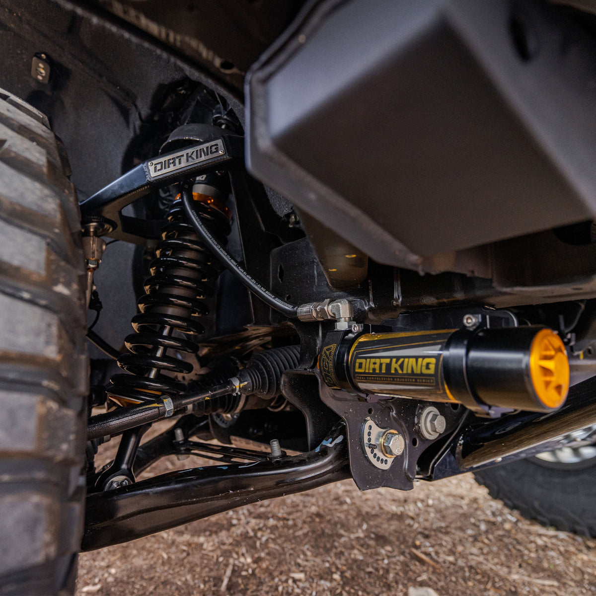 The Dirt King 2.5 Dual Compression Adjuster (DCA) Series coilovers will take your GM 1500's off-road capability to the next level while not compromising on-road comfort. Equipped with high-speed and low-speed compression adjusters, these shocks offer the flexibility to fine-tune ride quality across any terrain or driving style. Experience more control with increased wheel travel, more articulation, and higher ground clearance. The coilovers come preset with 3" of lift to level the vehicle but this can vary if you have other aftermarket upgrades. Included with the shocks is a spanner wrench allowing you to make adjustments. No detail was overlooked on this product to deliver the superior quality and performance that Dirt King is known for.